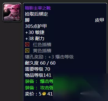 暗影主宰之靴 就鞋子而言的话这款黑暗神殿BOSS主母出品的暗影主宰之靴还是非常的适合猎人的,双插槽带爆击,属性和攻强也不错,其实就命中等的话猎人有T6加持是不会缺的,基本上带到T6没问题。当然如果你喜欢锁甲的话,那么下面这款黑暗神殿血魔出品的追踪软靴也是不错。
