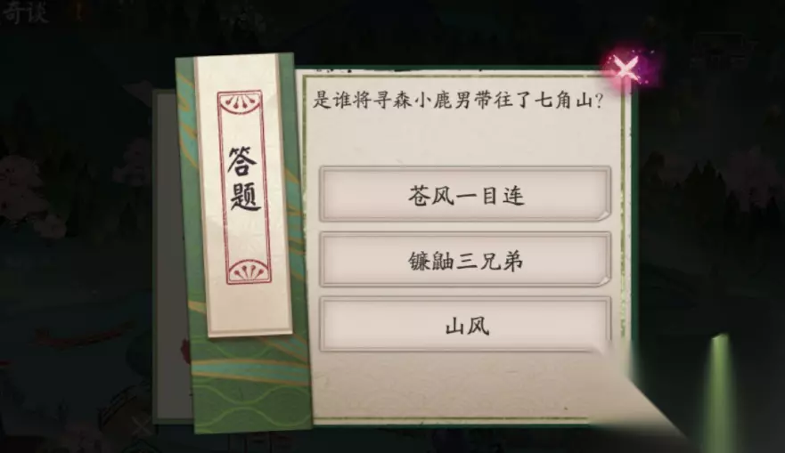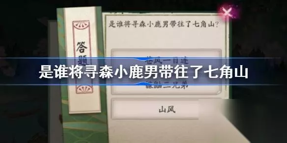 是谁将寻森小鹿男带往了七角山 问题 是谁将寻森小鹿男带往了七角山 选项 苍风一目连 镰鼬三兄弟 山风 答案 镰鼬三兄弟 由寻森小鹿男传记“后来的我独自漂泊,直到有一天,我遇到了镰鼬三兄弟。吵吵闹闹的三兄弟收留了我,简陋的屋檐下,他们嚷嚷着要我形容我心中的「家」他们又陷入了「这个简单!」、「闭嘴我先说!」的拌嘴,在吵嚷声中,他们带我去了名为七角山的地方。”可知,是镰鼬三兄弟将他带入七角山的。