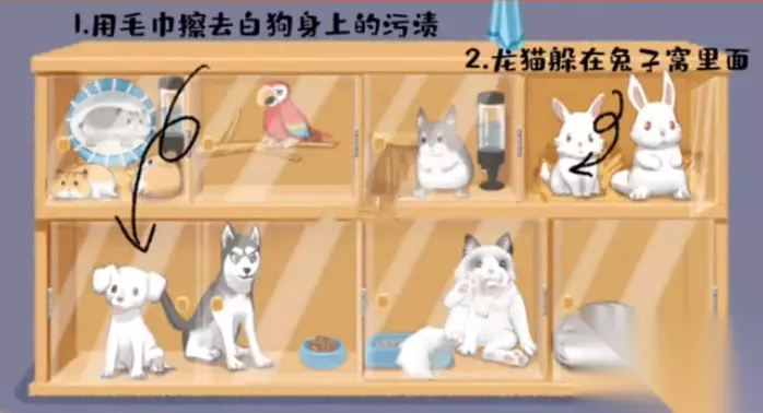 《超级收纳馆》阿猫阿狗通关攻略 1、第三关【阿猫阿狗】,首先使用毛巾,将白色小狗身上的污渍擦干净,哈士奇和小白狗放在一起 2、两只比较大的猫咪放在右下方的两个格子里 3、草堆里藏了一只龙猫,将其找出来,放在旁边的柜子里 4、最后将仓鼠、鹅鹅分别放在合适的格子里,即可收纳成功。不清楚的玩家可以参考图片。 这篇攻略就到此结束了,如果小伙伴们觉得这篇攻略有用的话,就是对小编最大的支持。小伙伴们可以持续关注233乐园攻略游戏网站!