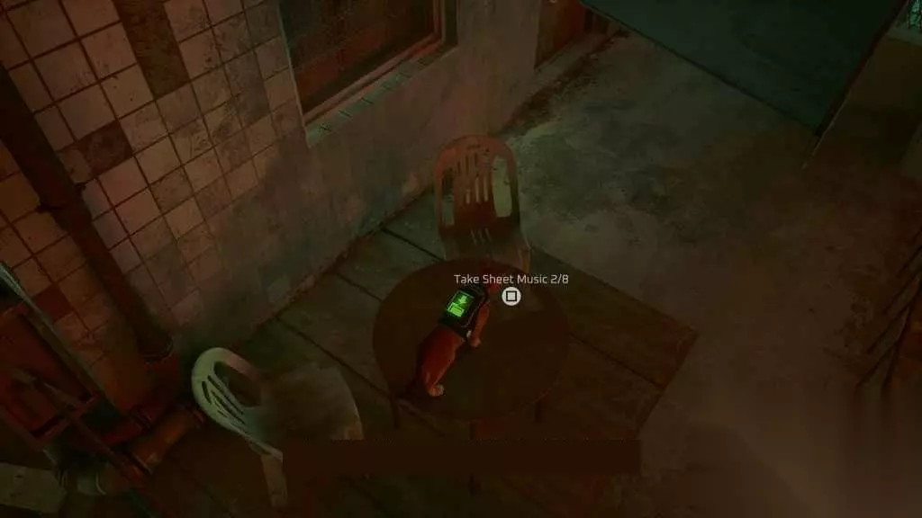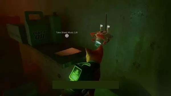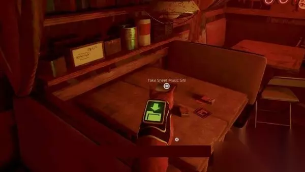 再往前走一次,就到了死胡同,角落里有个保险箱。您首先需要与保险箱交互一次,以删除便笺(如果您遵循便笺上的线索字符串,它将引导您找到我们之前在栏中发现的密码)。您可以与保险柜交互,然后输入1-2-8-3将其打开。然后,你可以从保险箱里拿起8/8的乐谱。