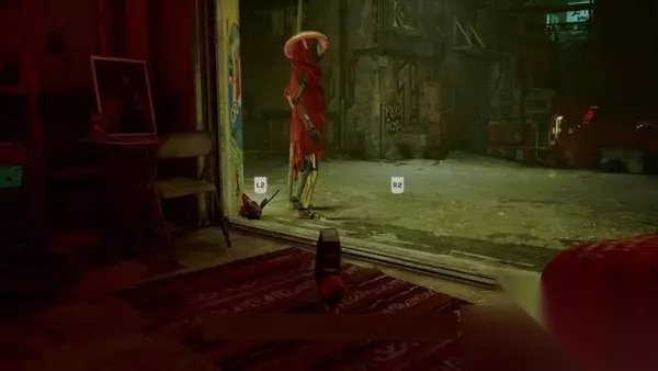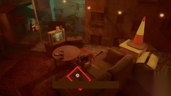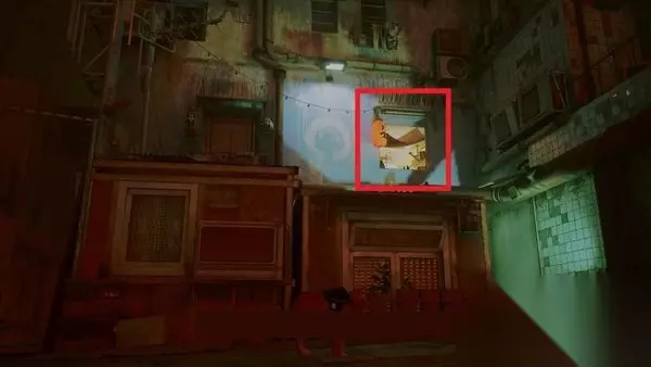 在屋顶上,你可以与穿着白色衣服的机器人互动,将油漆洒向对面。然后,当提示灯亮起时,你需要喵喵叫,使他们掉下油漆,让机器人从洗衣店出来。