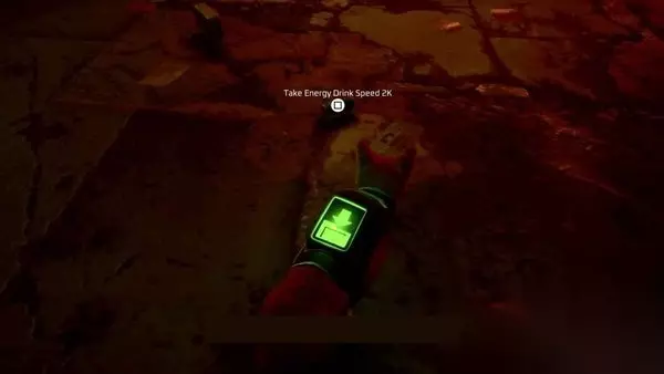 首先,从车库门走到左边,与点亮的自动售货机互动。拿起它吐出的1/4能量饮料。在本章中,你可以从机器上获得4种能量饮料,这是一些收藏品所需要的。