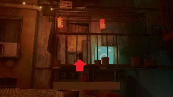 回到酒吧的屋顶,再往上看,再往上看,屋顶上的墙上有一个红色灯笼旁的书写符号。爬上去跳进那扇窗户。