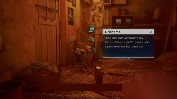 你可以把你得到的电缆给奶奶,让她做雨披。然后你也可以用鼻子蹭她的腿,这是本章中第四次也是最后一次。 转身走到两个机器人旁边的门前,上面有电路图。与它互动,抓取并被允许进入大楼,称为“Elliot编程”。