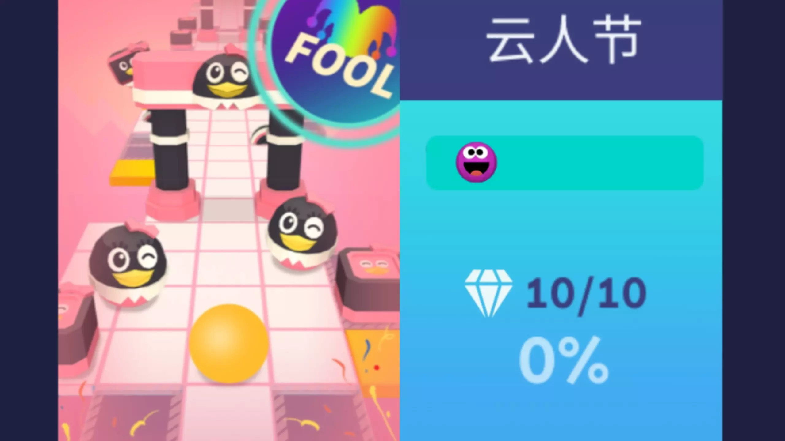 这是音乐游戏《滚动的天空》2026愚人节相关内容,展示了“云人节”“钻石工坊”两个愚人节关卡,前者回归花舞场景,有企鹅障碍;后者首次出现100个钻石,障碍和回归场景设计颇具愚人节趣味。