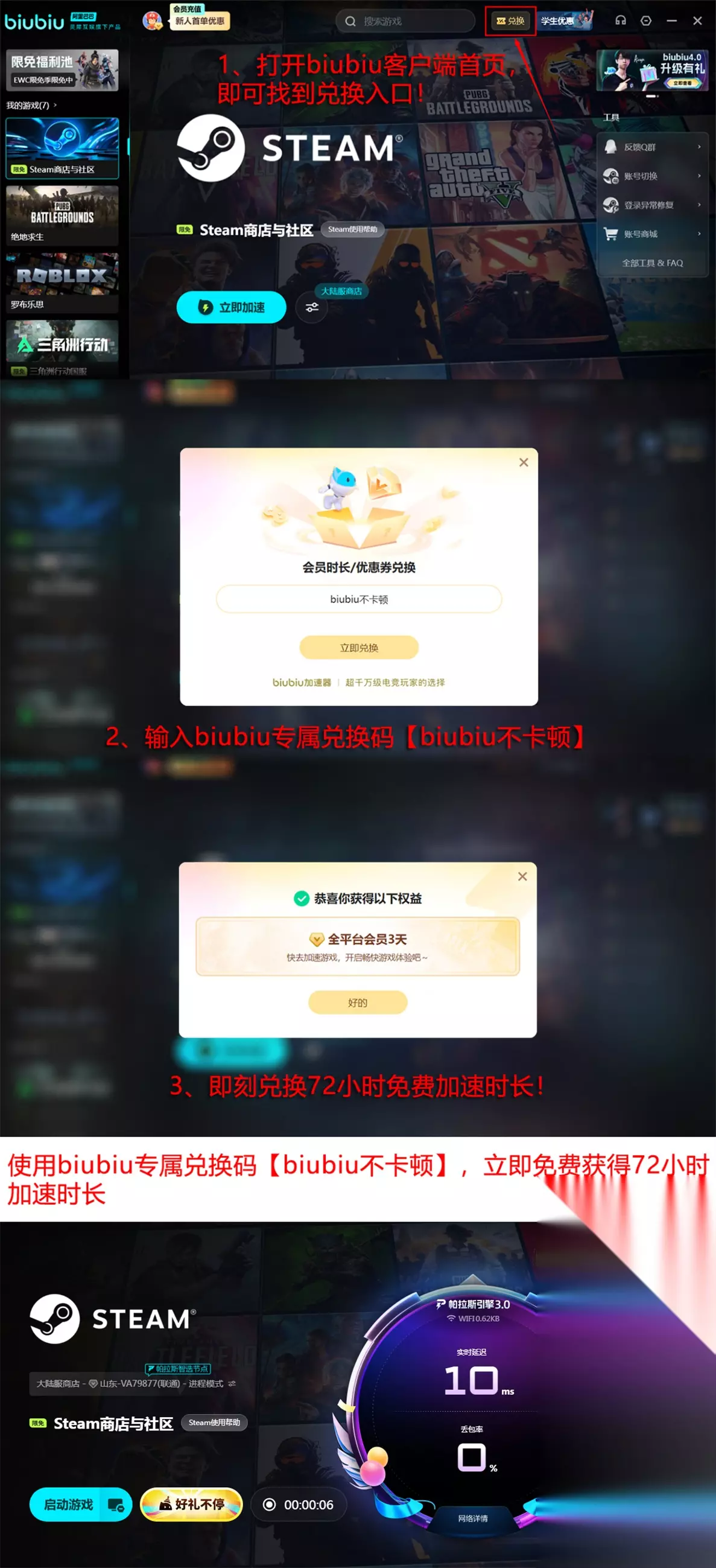 为帮助玩家直观评估优化效果,官方同步开放限时体验权益:输入兑换码【biubiu不卡顿】,可立即领取3天全功能加速时长,每个账号限用一次。新注册用户额外获赠24小时加速权限,叠加后总计享有96小时免费使用周期,充分满足测试与过渡期需求。