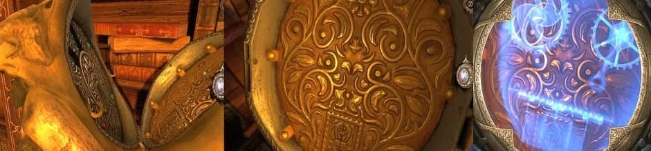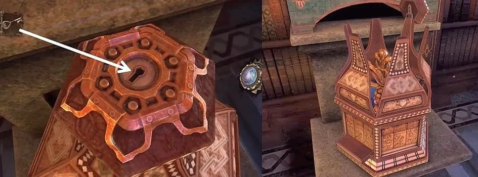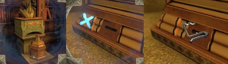 放大房间左侧箱子下方的绿色底座。将盖子向右滑动,然后将三辐封印用于显露出来的机关。