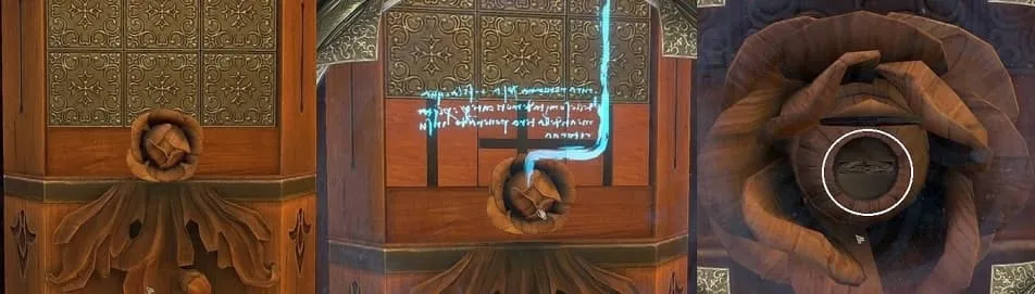 缩小画面,转向中间的灯。放大画面,观察信件上方的面板。 将玫瑰拖到底部的洞里,4 个面板就会打开。