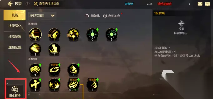 如何再点击左下方找到职业装换这个按钮,点入后就进入自由转职界面了,在跟职业导师进行对话后就能正式看见转职的界面,如果不记得另外一个职业的操作特性,还可以在其中体验感受一下,当确定自己转职目标后按下转职按钮就可以转职了。