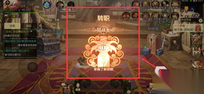 想要使用这个功能,还需要二个前提条件,第一个就是角色等级不能超过49级,第二个就是需要达到10级完成转职任务,在初次转职后就可以使用自由转职系统了,大家可以先顶级右下方的技能栏,进入技能系统的界面。