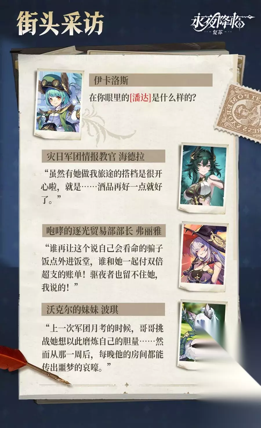 伊莲热聊 看完伊卡洛斯的采访后,驱夜者对这位百愿上仙多了解一些了吗?在你眼中的她,又是什么样的人呢?伊莲觉得,潘达虽然平时喜欢摸鱼,但从不会逃避其身上背负着的沉重使命,虽已忘记归途,但守护之心永存! 驱夜者们对这位全新的丛林守护者【潘达】是否期待满满?她的技能究竟有什么特殊效果,欢迎驱夜者在评论区留下你的看法哦~