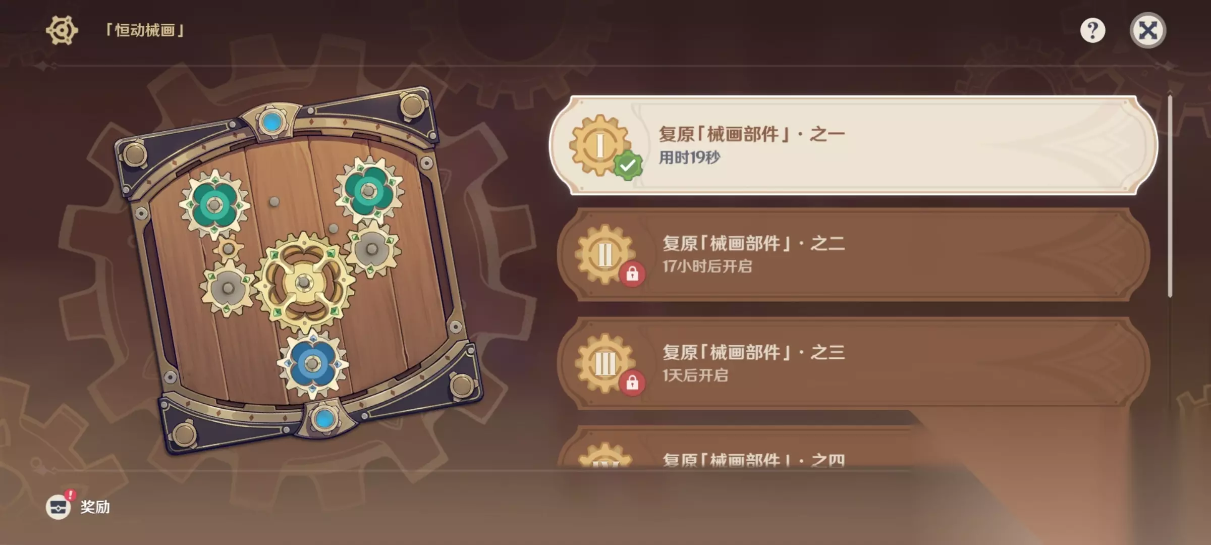 活动玩法 本次活动简单来说就是:将「械画部件」内的齿轮摆放到正确的位置。 每天都会开启一个可复原的新部件,一共六天,六个部件都复原后,可将「械画部件」以正确的角度安置在特定位置,以拼接成整幅「恒动械画」。 (注意:不需要将所有方位都放上齿轮,可能存在方位上没有齿轮的情况!) 《原神》恒动械画械画部件之一攻略这个问题解决方法也就这么多了,解决的步骤是不是非常简单,后续还有游戏上的难题可以关注我们网站,让你一步解决到位。