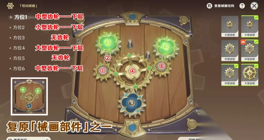 《原神》恒动械画械画部件之一攻略 方位1:中型齿轮——下层 方位2:小型齿轮——下层 方位4:大型齿轮——下层 方位6:中型齿轮——下层