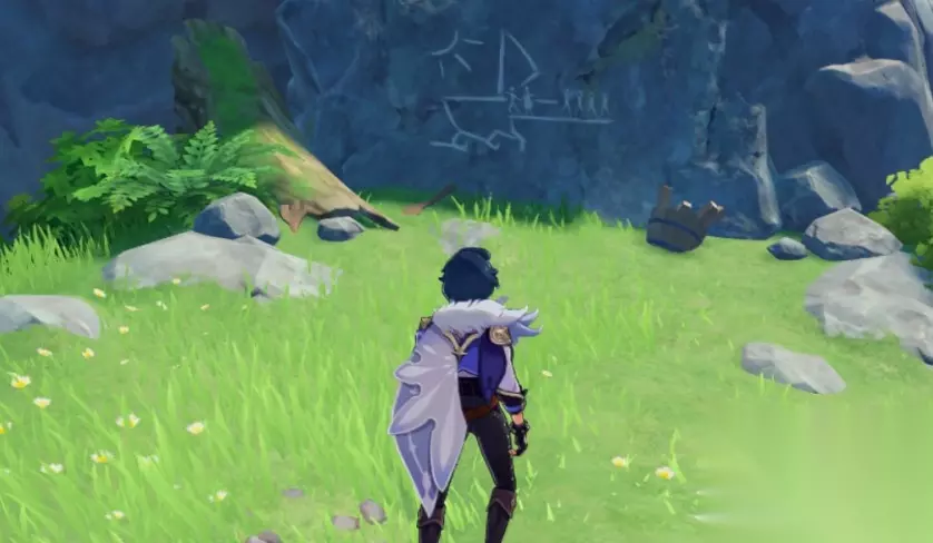 第2处壁画:双双岛的壁画 解锁双双岛所在传送锚点后传送至该位置,按照下图所标记方向前进; 该处壁画所在位置位于标记处下方的石壁上; 抵达该处之后交互观察,使用拍照功能保存之后即可在背包中查看。