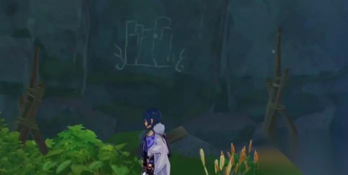 第3处壁画:危危岛的壁画 解锁危危岛所在传送锚点后传送至该位置,按照下图所标记方向前进; 该处壁画所在位置位于标记处下方的石壁上;