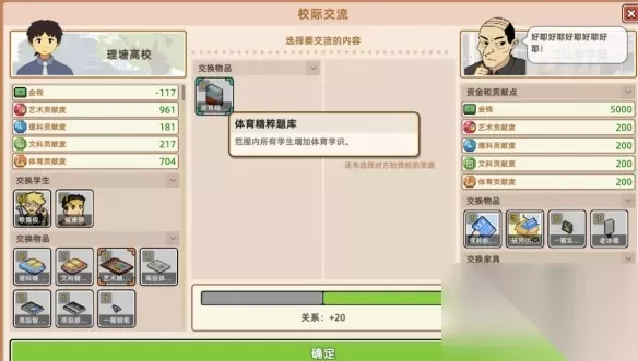 3.为什么要开这个生源,因为这里是前期最稳定的收入来源,不要指望黄泥村,都是穷学生养不起学校的。 开了之后就只招歌舞一条街的学生了,黄泥村后续的学生就卖给其他学校拉关系就行。 4.关于其他学校的关系 (1)每周(即每个季度)可以赞美,每周通过赞美最高涨8点好感。 (2)贩卖学生涨关系,卖黄泥村的大约每3人涨1点好感。 (3)好感60前不能交易 (4)好感60后可以卖物品,并且可以多次交易实现瞬间从60涨到100。 (5)图一的物品是不能交易的,必须开图二才能快速卖物品拉关系,所以在完成一本的各种必要基建之后,就直接冲二本。 5.二本之后迅速开图,开出最右边的地图,这个商店可以买到关键性的拉关系物品