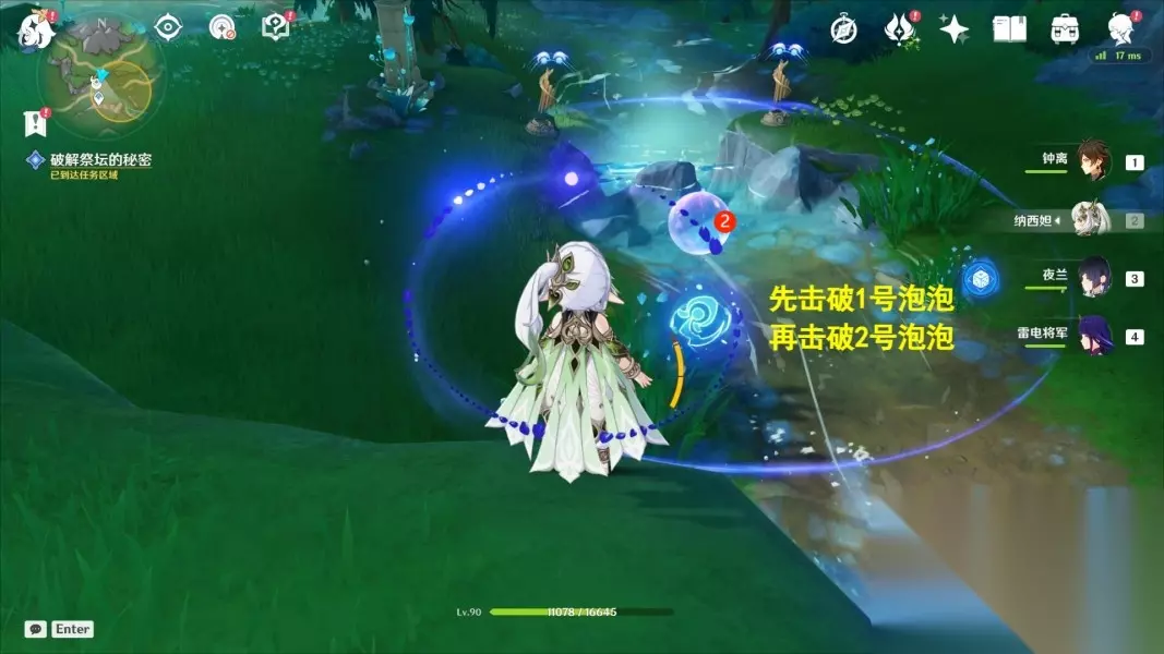9、我们先将泡泡移动到如图的位置,按照顺序击破泡泡,即可完成解谜挑战