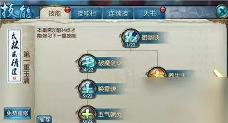 神剑御雷真诀:同时攻击3个目标,能攻击的目标数在技能等级30/60时会增加一个。 天灵剑诀:法术攻击单个目标,目标剩余血量越少天灵剑诀的伤害越高。 挑月剑诀:同时法术攻击2个目标,附带降低目标速度3回合,并有概率使天音队友施放醉罗汉降低目标防御2回合。 玄清心经:降低目标法力,并回复自身法力。 唤雷剑诀:连携技,当焚香队友使用三昧真火时,有概率使用唤雷剑诀攻击目标。 碎玉剑诀:减少敌方全体目标法力,并附带减少等量气血。 净秽诀:解除单体负面状态,但无法解封印和毒。 醉风望月:给自身增加一个持续2回合的魔法盾,受到的50%伤害用1.5倍于伤害的法力值来代替,技能等级越高所需消耗的法力越低。 生命放逐:有概率使目标进入冰冻状态,3回合,冰冻状态下无法行动,并且受到所有伤害变1。 万剑归宗:终极奥义,依次对5个目标造成大量法术伤害,使用虚弱一回合,5回合内无法再次使用。
