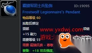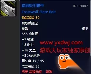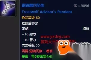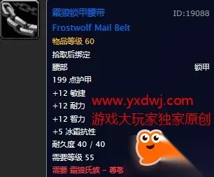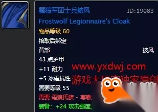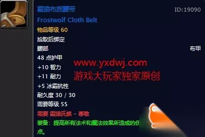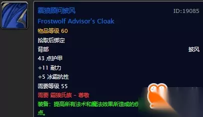 10智11耐5冰抗,18绿字。属性非常优秀的腰带,在没有拿到自己职业的紫装腰带之前强烈建议带着个,比副本里的东西都要好。 霜狼军团士兵,顾问披风