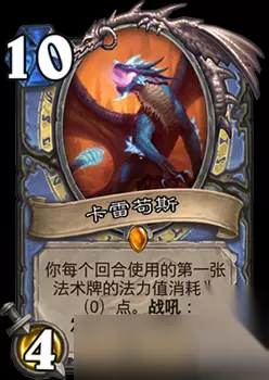卡雷苟斯基础属性 费用:10攻击:4生命:12 类型:随从品质:传说职业:法师 种族:龙合成费用:100/1600来源:暗影崛起扩展包 卡牌效果 你每个回合使用的第一张法术牌的法力值消耗为0点。战吼:发现一张法术牌。 卡雷苟斯测评