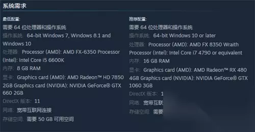 最低配置 需要 64 位处理器和操作系统 操作系统:64-bit Windows 7, Windows 8.1 and Windows 10 处理器:Processor (AMD): AMD FX-6350 Processor (Intel): Intel Core i5 6600K 内存:8 GB RAM 显卡:Graphics card (AMD): AMD Radeon™ HD 7850 2GB Graphics card (NVIDIA): NVIDIA GeForce® GTX 660 2GB DirectX 版本:11 网络:宽带互联网连接 存储空间:需要 50 GB 可用空间