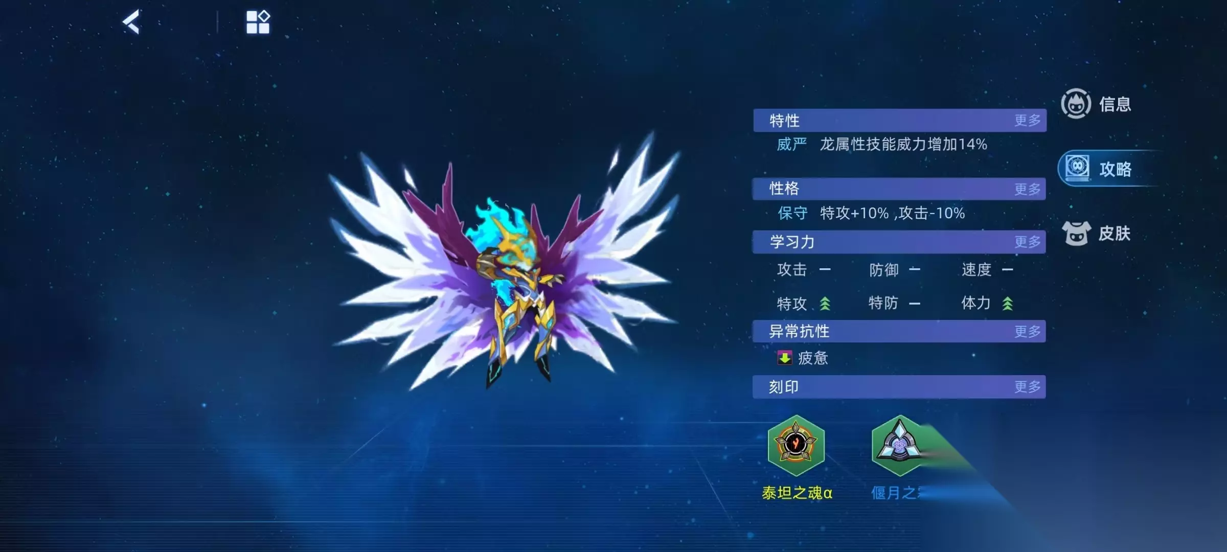 在技能搭配方面,推荐选择怒雷惊空、掣电归来,魔神觉醒,御风奔雷决,九霄千灭闪等。其中九霄千灭闪不仅威力大,还能吸取对手能力提升状态,吸取成功后对手两回合内无法通过自身技能恢复体力。御风奔雷决先出手的时候威力直接变为两倍,只要具有速度优势,伤害非常爆炸。怒雷惊空除了伤害之外,还能消除对手回合类效果,先出手时两回合内免疫异常状态。掣电归来带来的效果是免疫异常,魔神觉醒具有全属性强化,吸血,先制以及增伤等一系列优势。