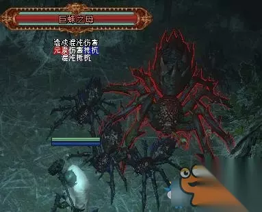 技能一:无截图,日后补 (欧克跳起来砸到你的身上,嗯,叫跃击。因为选择了帮他就不能再跟他打了,所以无图) 技能二:抡一棍子 (欧克轮了一棍子,对所有人进行横扫。无情难度才有) 技能三:吼 (欧克大喊:红球强无敌。释放战吼,获得红球,被击中时有很少时间的无敌。无情难度才有) 对抗方法:三个弱鸡,弱的飞起~ 巨蜘之母(织网者巢穴)