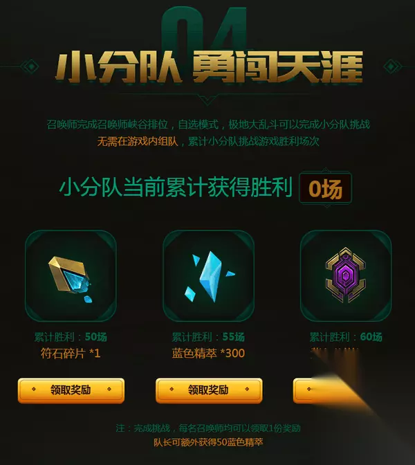 04 小分队 勇闯天涯 召唤师完成召唤师峡谷排位,自选模式,极地大乱斗可以完成小分队挑战 无需在游戏内组队,累计小分队挑战游戏胜利场次
