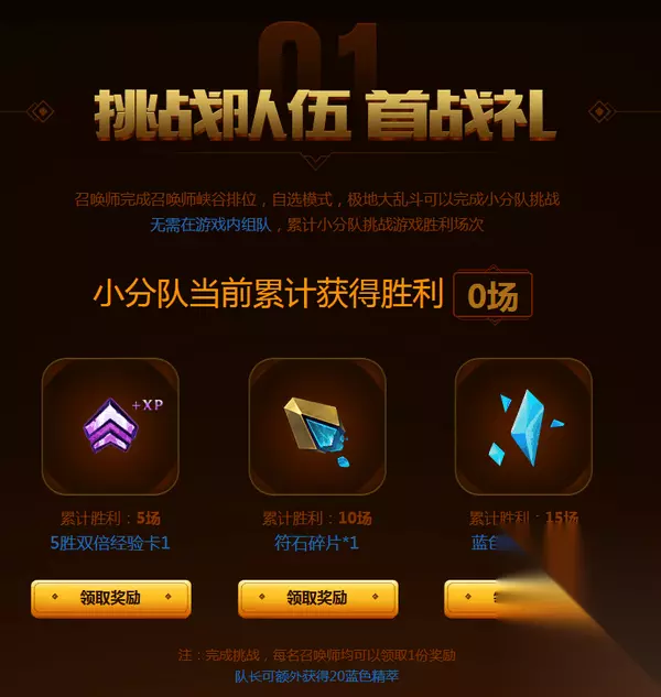 01 挑战队伍 首站礼 召唤师完成召唤师峡谷排位,自选模式,极地大乱斗可以完成小分队挑战 无需在游戏内组队,累计小分队挑战游戏胜利场次