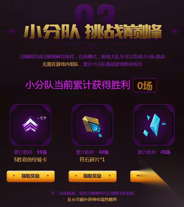 02 小分队 勇攀高峰 召唤师完成召唤师峡谷排位,自选模式,极地大乱斗可以完成小分队挑战 无需在游戏内组队,累计小分队挑战游戏胜利场次