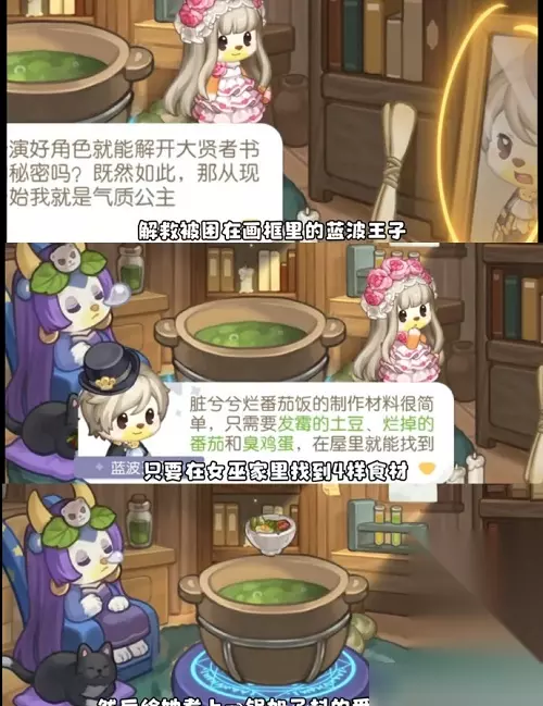 找到四样食物:发霉的土豆、烂掉的番茄和臭鸡蛋,煮上一碗加了料的番茄饭,即可! 3、和王子去探险。