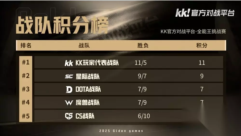 经过五天的激烈比拼,GG全能王挑战赛积分循环阶段正式收官。KK玩家代表队、星际战队、DOTA战队以及魔兽战队凭借出色表现成功突围,挺进最终决赛。10月24日至25日每晚19点,巅峰对决准时开启,四支强队将为首届“全能王”桂冠展开最后争夺,谁能问鼎冠军宝座,即将揭晓。 回顾积分赛程,赛场上的精彩对局层出不穷,既有情怀满满的经典重现,也有跨项目对抗带来的全新看点。盖哥时隔二十年重返星际战场,熟悉的战术与操作唤起无数回忆;现役顶尖人族选手跨界挑战CS高手virgo,不同项目的思维碰撞激发出别样火花;而魔兽战队首次尝试CS项目的对狙环节,也在紧张赛程中增添了不少轻松笑点。所有比赛录像已完整上线,观众可通过指定平台随时回看全程精彩。 决赛阶段将采用淘汰制对决。10月24日晚19点,率先上演的是魔兽战队与DOTA战队之间的季军争夺战;10月25日晚19点,则迎来KK玩家代表队与星际战队的冠军之战,荣誉之巅,一触即发。 本次决赛解说阵容再度升级,老搭档BBC与magic杨将继续坐镇直播间,带来兼具专业性与趣味性的赛事评述。同时特邀CS领域传奇人物Alex卞正伟亲临解说席,携手老朱与三炮共同打造高质量观赛体验。 哪支队伍最有可能捧起全能王奖杯?赛事中哪一个瞬间让你印象最为深刻?欢迎一同分享这场竞技盛宴中的感动与热爱。 体验多项目竞技乐趣,挑战自我极限,尽在KK对战平台。见证GG全能王诞生,下一个全能高手,或许就是你。
