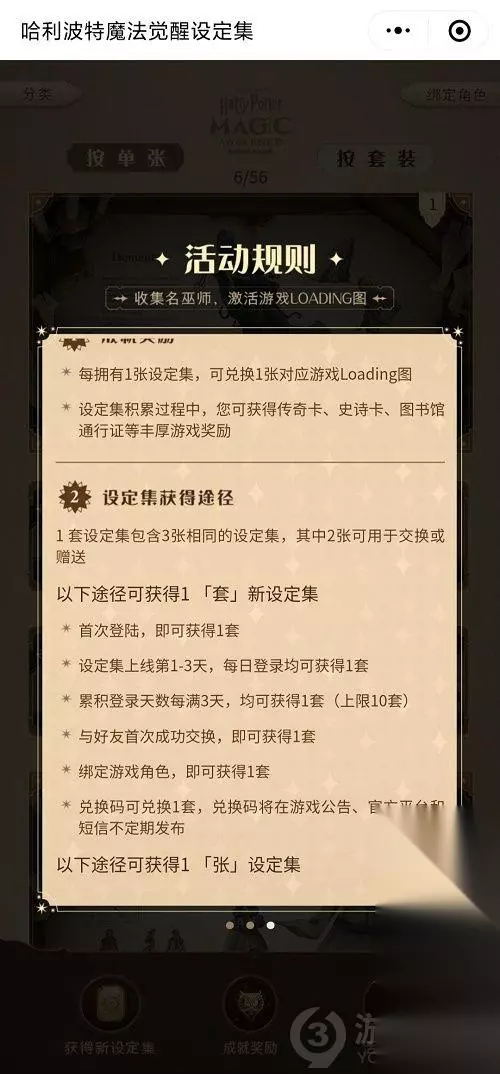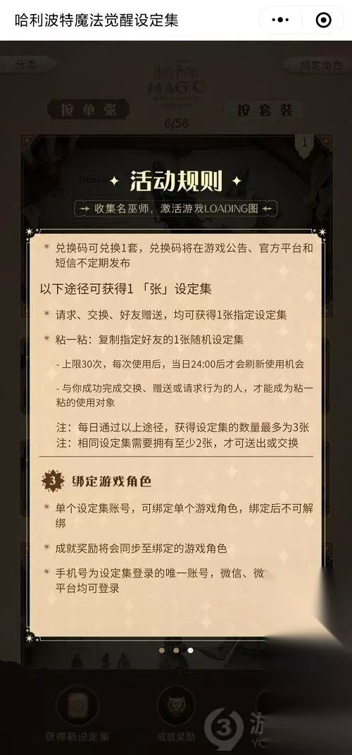 哈利波特魔法觉醒设定集兑换码有哪些 设定集活动位置 微信有个小程序,里面有个设定集活动(奖励最高档是个随机金卡)。 和好友交换一天最多换三次 每天签到会送一次 绑定角色送一次 首次登录小程序送一次 官方后续好像会发口令之类的,能换一次。 里面有些卡需要游戏开服之后,完成对应标准获得。 兑换码见最下面