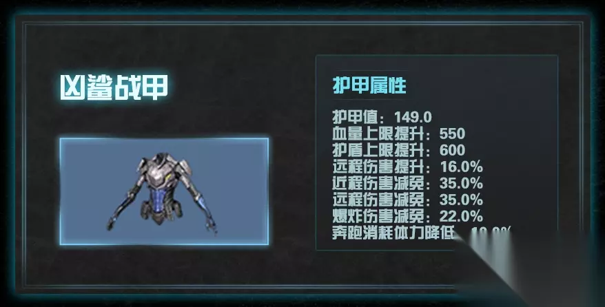 4.凶鲨战甲 较奇袭战甲属性值微提升。 增加了16%远程伤害提升,拥有涂装特技强化精工大胃王,提升大量的护甲和血量。