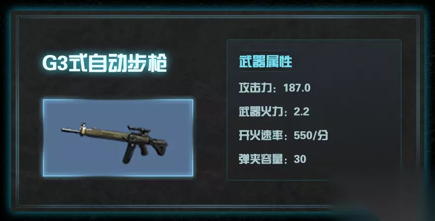 2.G3式自动步枪 轻巧的自动步枪,性能均衡且配备光学瞄准镜。 在各种距离的作战中都拥有优秀的稳定性和安全性。