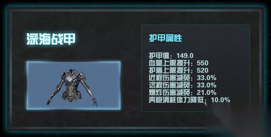 2.深海战甲 高级的战斗防具。 提升大量的护甲和血量。