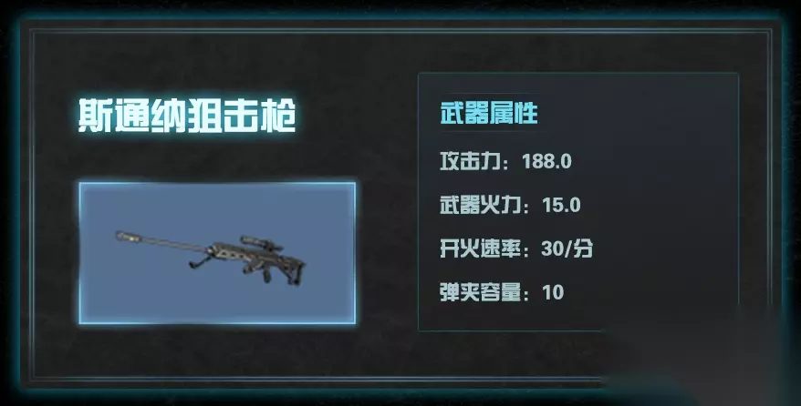 4.斯通纳狙击枪 远距离高精度的狙击步枪,拥有着极高的精度,往往可以一击造成高额伤害。 建议使用狙击武器时,找个隐蔽的高处蹲点出击。