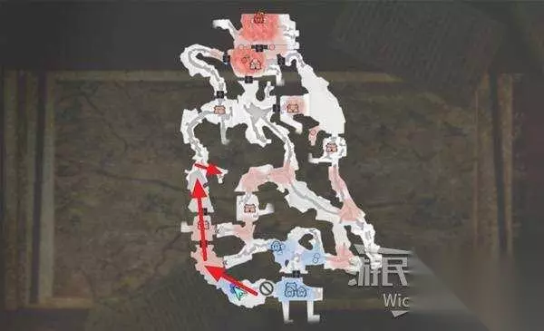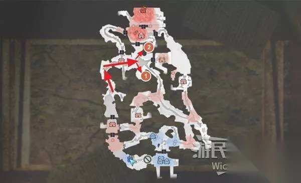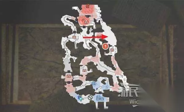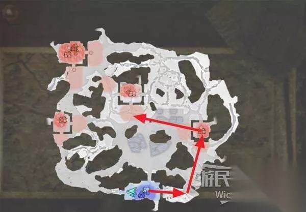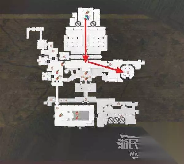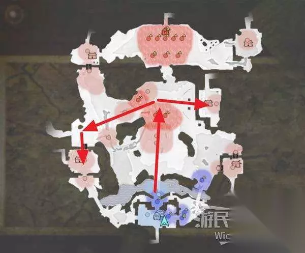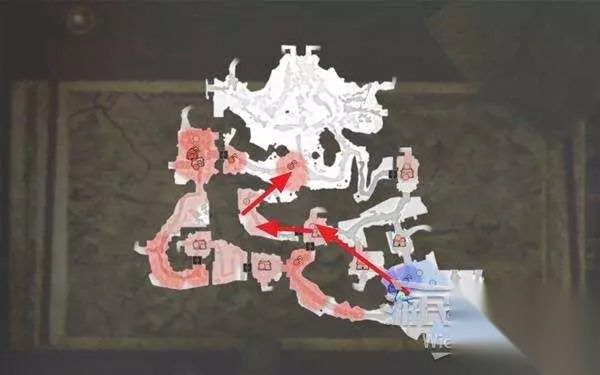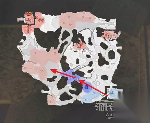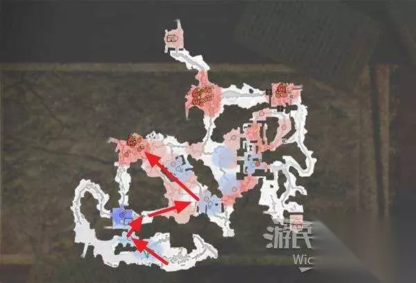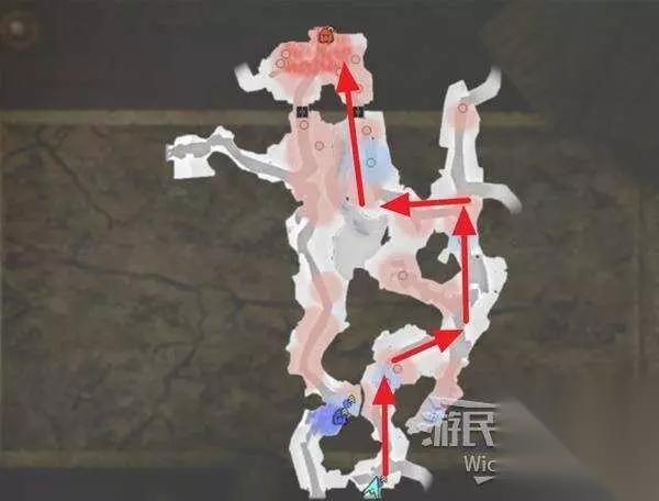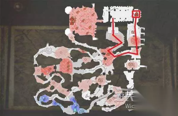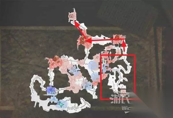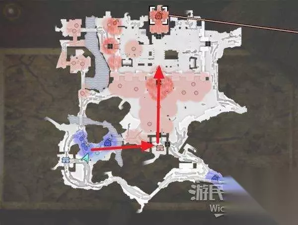 右上角区域会触发幻影急袭的效果,想要破除这个效果我们需要在五分钟内找到张梁。 这里直接沿着下图路线往右侧高台走,张梁就在红框处。