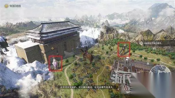 不一会王云来到一个广场休息,此时貂蝉会往旁边移动消灭出现的刺客,先跟着貂蝉帮她打一会,这里时刻注意地图,一会还会刷出两个刺客到王允身边。 看到新刺客立刻折返,让貂蝉打一个残血的,我们负责击败王允旁边的,后面的流程相同,一直将王允送到地图上方完成任务。