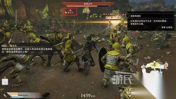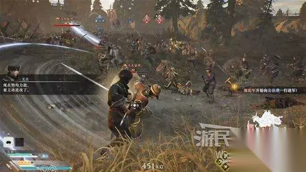开局先往中部战场走,可以解救两个村庄,将敌人清理完往左上角杨奉大军位置走,可以触发一个冲刺效果。 这里需要击败指定数量的敌军来获得勇猛奋战效果,连续在人群里跳劈很管用。