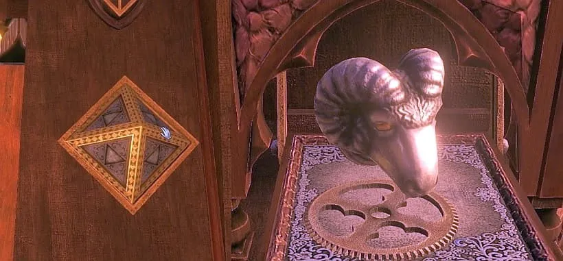 把这部分完全拉下来,会有一个雕像滑下来,而谜题就在底部。