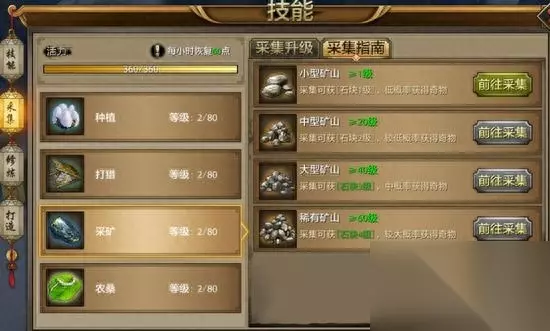 采矿 产出:为铸造提供生产材料,采集可以获得石块,可以合成矿石。用于打造装备戒指和护肩。采集过程中可以获得的奇物是细磨石,松烟墨,奇石。同样用于跑环任务和出售获取银两。技能升级后,可以采集更高级的石块,合成高级的矿石。 升级:需要使用帮会商店中兑换的徐霞客游记进行升级,需要帮贡兑换。