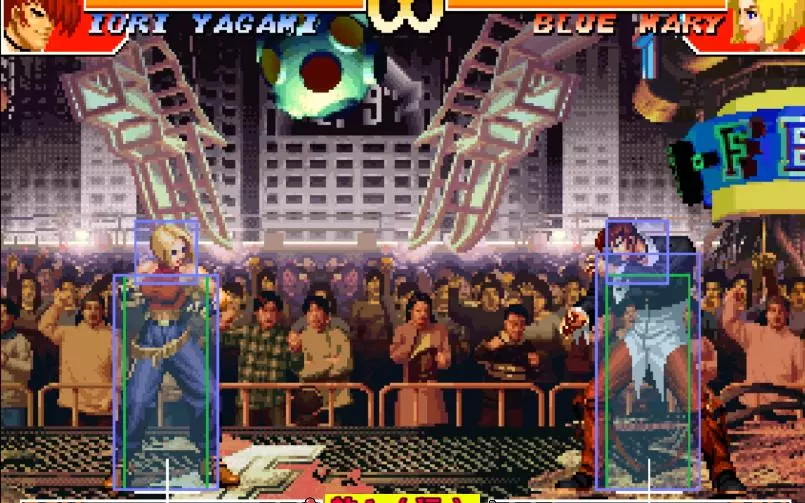 绿色为身位框,蓝色为受击判定框,红色为攻击判定框,粉色为飞行道具攻击判定框,黄色为投技抓取框。 视频内容欢迎97爱好者转载、二创等。