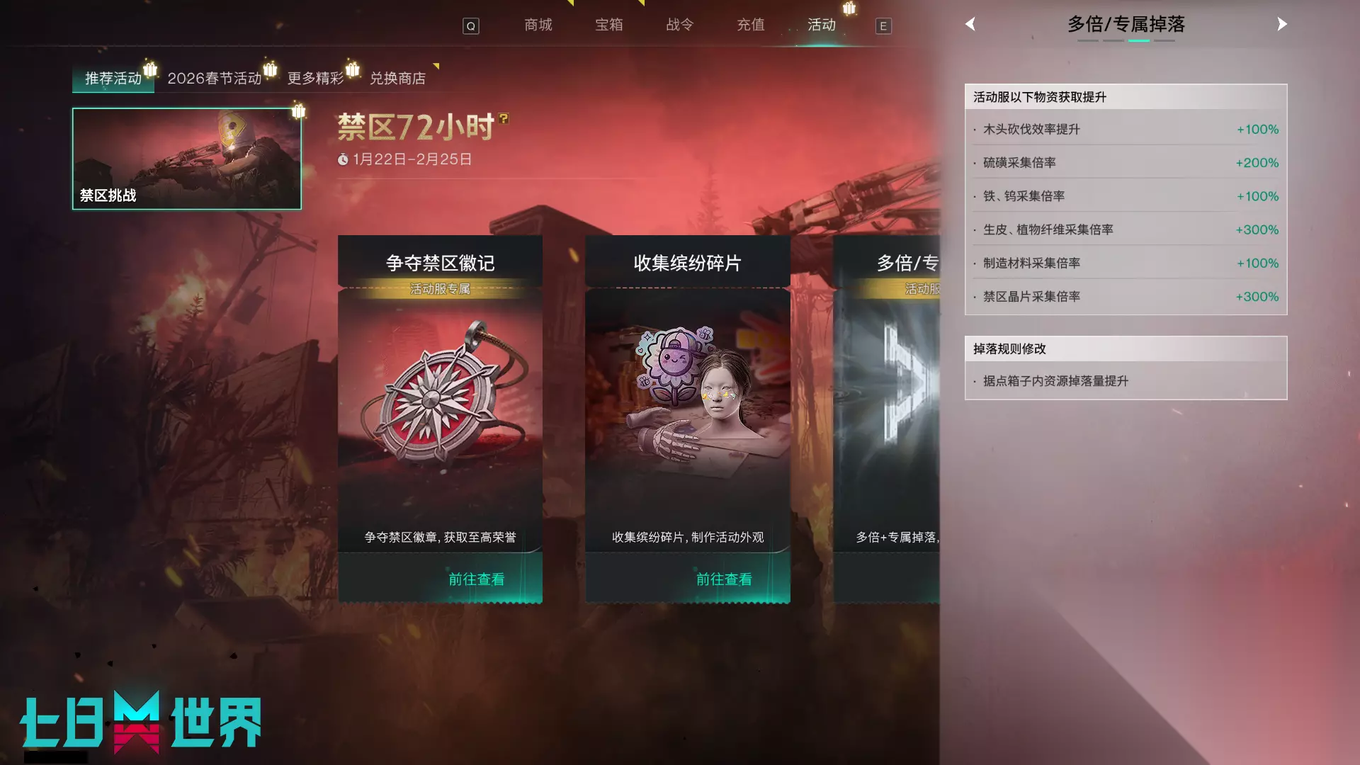 活动规则: - 72小时快节奏服务器,3日决胜!活动服仅持续72小时,对应的,物资获取效率将大幅度提升,每日还可领取大量物资补给,助您快速激战! - 争夺空投,获取禁区徽记,成为禁区之王!活动服中每小时都将投放大量空投,空投中包含特殊道具:禁区徽记。禁区徽记不可存入背包外任何容器,死亡会全部掉落。每个服务器会按照您背包中的徽记数量进行排行,排行前50名超越者可获取排行榜奖励,前3名超越者将获取活动奖杯,证明您的荣耀身份。 请注意,排行榜奖励将在活动服结束后结算发放。如果提前退出活动服,禁区徽记也会清空,无法获取排行榜奖励。 *对于涉嫌使用外挂的超越者,我们将追回所有排行榜奖励并在官网公示封禁和追回情况,请超越者积极举报异常游戏行为,守护禁区的公平正义! - 获取缤纷碎片,制作专属外观!活动期间,禁区服和活动服的空投都将获得道具:缤纷碎片。缤纷碎片可以制作活动专属外观和染料。值得注意的是,缤纷碎片同样无法放入背包外的任何容器,死亡后会全部掉落,退出服务器时会全部清空。您需要在一次旅程中收集、获取。 * 非禁区服可以使用星愿代币进行兑换。