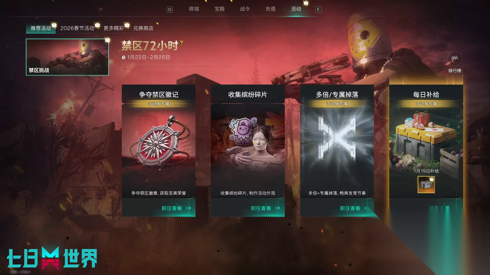 禁区模式大更新 禁区模式也将在这个版本迎来大更新!带来众多新内容和优化,带来更激爽的战斗体验。除此之外,为了便于更多超越者了解禁区的魅力,我们还推出了禁区特别活动——禁区72小时!服务器仅持续3日72小时,关键物资获取效率翻倍,每日领取大量物资补给,助您快速发育;每小时均有大量空投,争夺空投,是成为禁区之王的关键!快来看看吧~ 禁区模式专属活动——禁区72小时! 为便于更多超越者了解禁区魅力,我们将在版本更新后开启特别活动:禁区72小时,推出全新的3日激爽战斗服。 活动开启时间:2026年1月22日版本更新后到2月25日结束,第一批服务器将于每个大区服务器时间19:00开启。您可以在版本更新后进行报名。每个大区均会开放至少1个服务器,方便超越者进行体验。我们将视参与情况开启后续服务器。 开启禁区72小时活动的服务器将作为一个单独的剧本分类,会标注“活动服”标签。