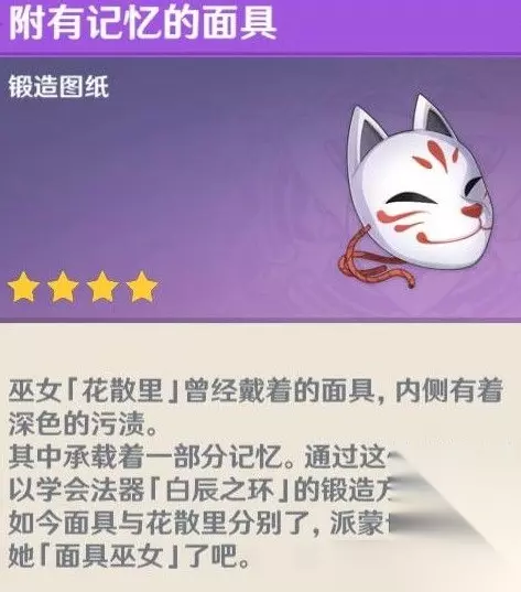 原神手游神樱大祓狐狸面具作用详解 面具用了解锁武器图纸,白辰之环,没什么用,这个东西就是有点纪念意义和价值。 很多人最初以为是装饰品,用了戴角色头上的。全部任务完成会有“附有记忆的面具”。 是锻造图纸,使用后会被摧毁。白辰之环是加充能的法器,是用是留,请大家酌情选择。