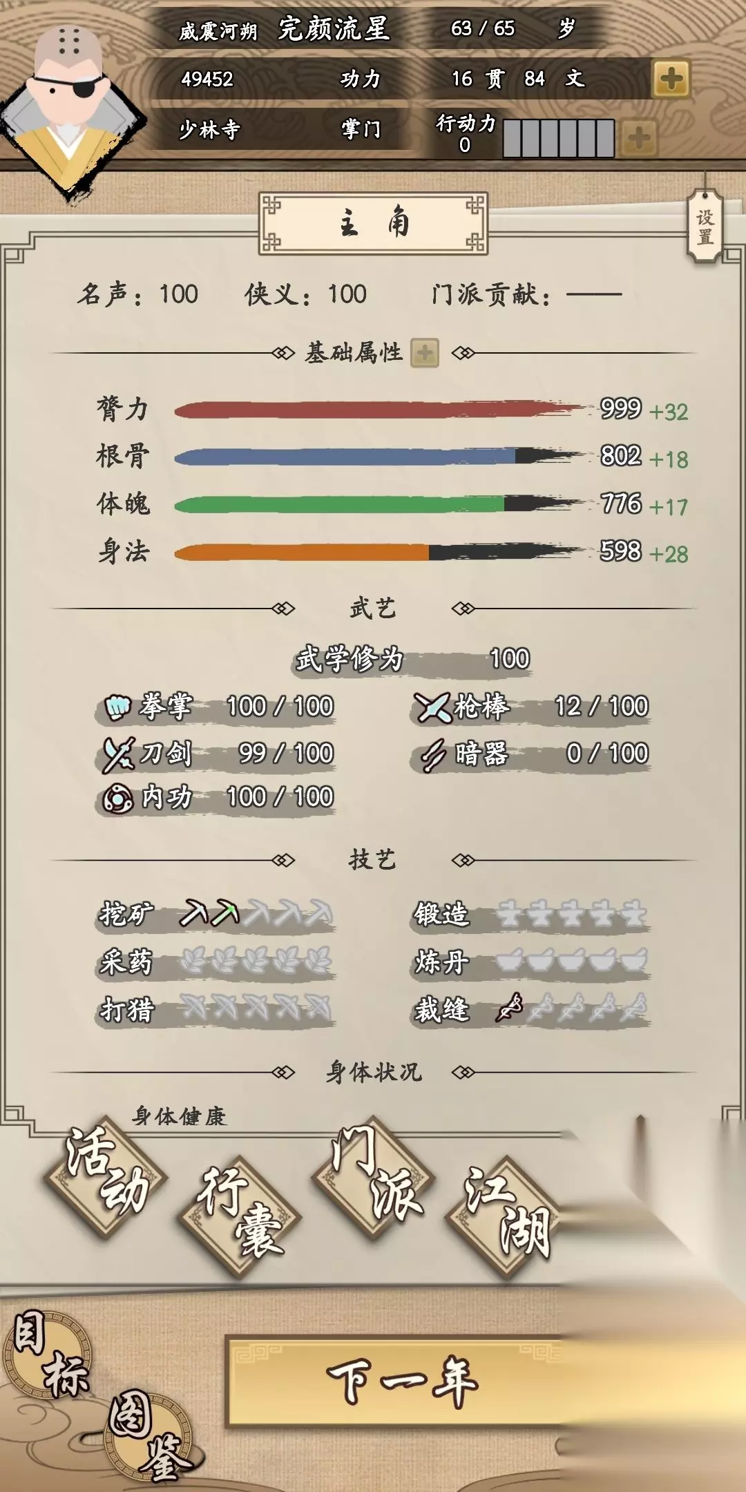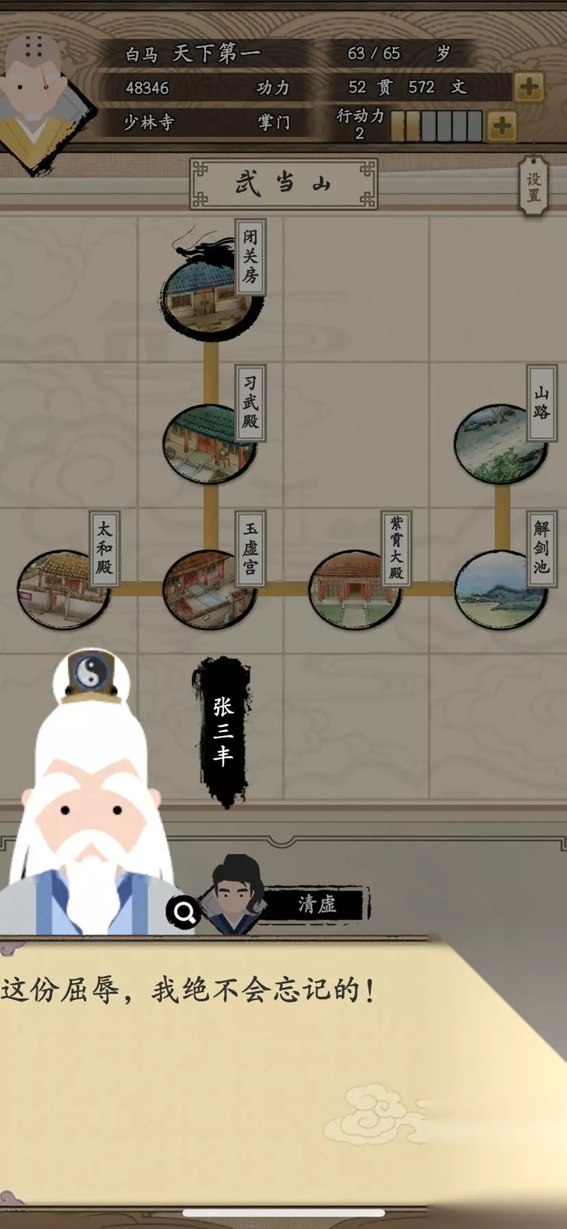 3.提升武功上限不要急,少林的话按着剧情走到了时间自动提升,其实好像就是学会一个武功就加10点,因为只能学10种,上限100点。 4.因为是一次一天内通关,所以所有加四维加钱加行动看完,钱我只买了武功没买任何装备和礼物。前面说30后不做任务,因为后面佛系攒钱够了,只需要再买两本秘籍就够了,其余任务得。 少林跟着主线走,武功加满,到了时间自己送你秘籍提升地位。 我选的少林6种搭配全真4种,由于前期没经营好没学完,学完后遗忘少林长拳就行了刚好10个,加成也刚好达成。 学习一气化三清不要去买绿色剑法加剑修为,直接找武功图标是剑的队友切磋,两三次就能有30点。 队友提升很佛系,没搞懂,有时候比我战力还高,只要通了36000的任务后面就乱搞了,大家都有群攻招式。