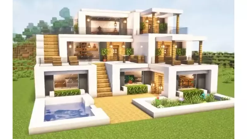 本次分享的是9块地皮带车库和花园的别墅建造教程,展示了别墅从搭建墙体、屋顶,到规划下沉式客厅等建造步骤,成品外观精致,内饰教程将在下期发布。