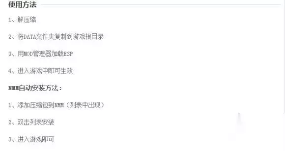 实际上是和没说一样的,由于上古卷轴丰富的扩展性,并不是每一个mod都有固定的触发方式,就比如这个葛兰蒂丝随从,需要你到裂谷城破碎的大酒壶招募才可以,你如果按说明进入游戏后不会发生任何变化的!!!而服装也有条件获得,并不会进入游戏就穿到你身上,有的需要锻造,有的需要到指定地点获得!!比如cbbe的逆袭130件套需要去锻造,而天际鞋包要在风宅取得 所建议建议大家,一旦那个mod有详细说明的话,你可以建立个文档,把说明复制一份和mod保存在一起,下次我怎么用就明白了,比如我,