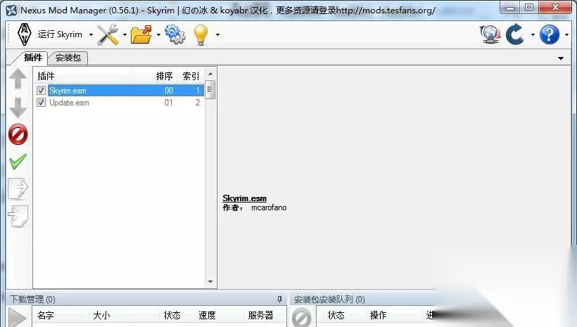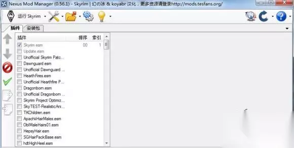 如果你下载的是最新版本的游戏的话应该不止这两个文件,最新版的集成了龙裔,炉火和黎明守卫三个dlc 左面一列,分别是将插件上移和下移,禁止所有插件,激活所有插件,导入排序列表和导出排序列表,因为不同的mod安装后需要排序,排序不对很有可能造成冲突,激活所有插件,点击后就会给所有的esp,esm勾选,进游戏里就会生效,反之禁止所有就是全不选定,导入排序列表就是给每个mod排好序生成的一个txt文档,你导入后就会按文档里面的进行排序,到处则是你排好序后可以生成排序文档,下次在使用同样的mod时候可以直接导入,避免在此排序麻烦。然后点击一下“安装包”按钮,会切换到另一个界面